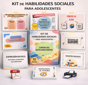 Este kit reúne un conjunto de herramientas psicoeducativas diseñadas para apoyar el trabajo clínico con adolescentes en temas como identidad, autoestima, regulación emocional, habilidades sociales, comunicación y toma de decisiones.