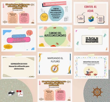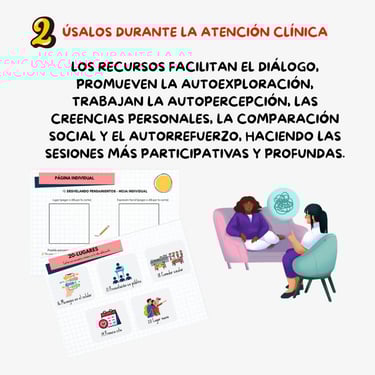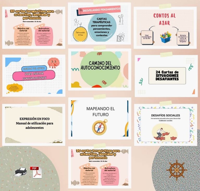 Este kit reúne un conjunto de herramientas psicoeducativas diseñadas para apoyar el trabajo clínico con adolescentes en temas como identidad, autoestima, regulación emocional, habilidades sociales, comunicación y toma de decisiones.